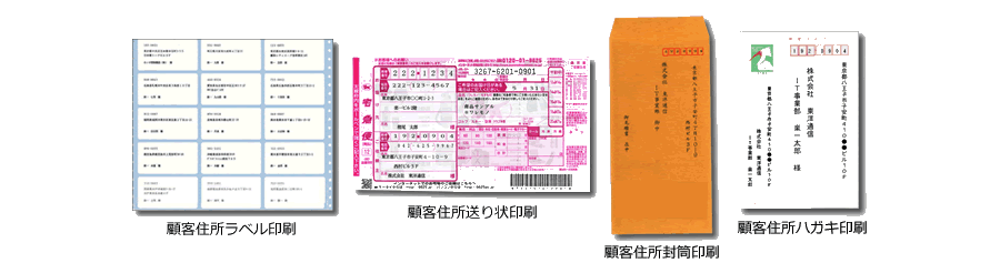 予め、顧客情報を登録しておけば、いつでも簡単に封筒や封筒に貼るラベルシール、ハガキ、宅配便送り状に印刷が出来ます!急いで書類を送りたい時など素早く印刷出来るので、とても便利です。※また売上伝票(納品書など)で入力した内容を送り状や封筒などに、同時に印刷することも可能です。