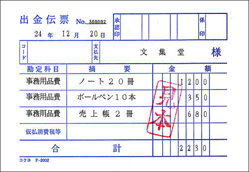 入金伝票と出金伝票には日付、入金先、勘定科目、摘要、金額等を記入します。