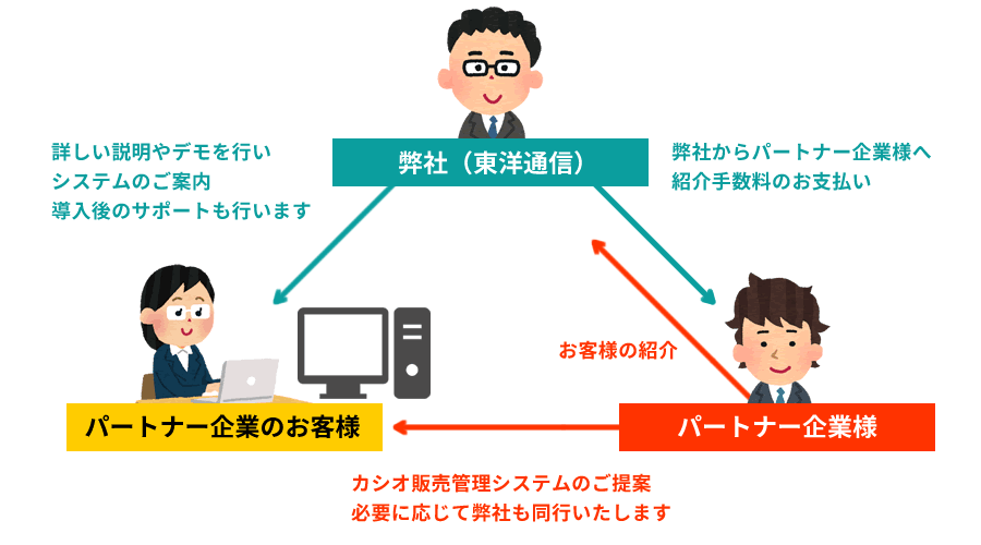 カシオ販売管理システムをあなたのお客様に提案していただくだけで、後は弊社がお客様にシステムの詳細説明や機械を実際にお持ちし、動きを見てもらうデモストレーション等を行います。導入に至った場合は紹介手数料をお支払いいたしますもちろん、導入後はお客様へのサポートも弊社が行います。パートナー企業様は紹介していただくだけでOKなのでご安心下さい。