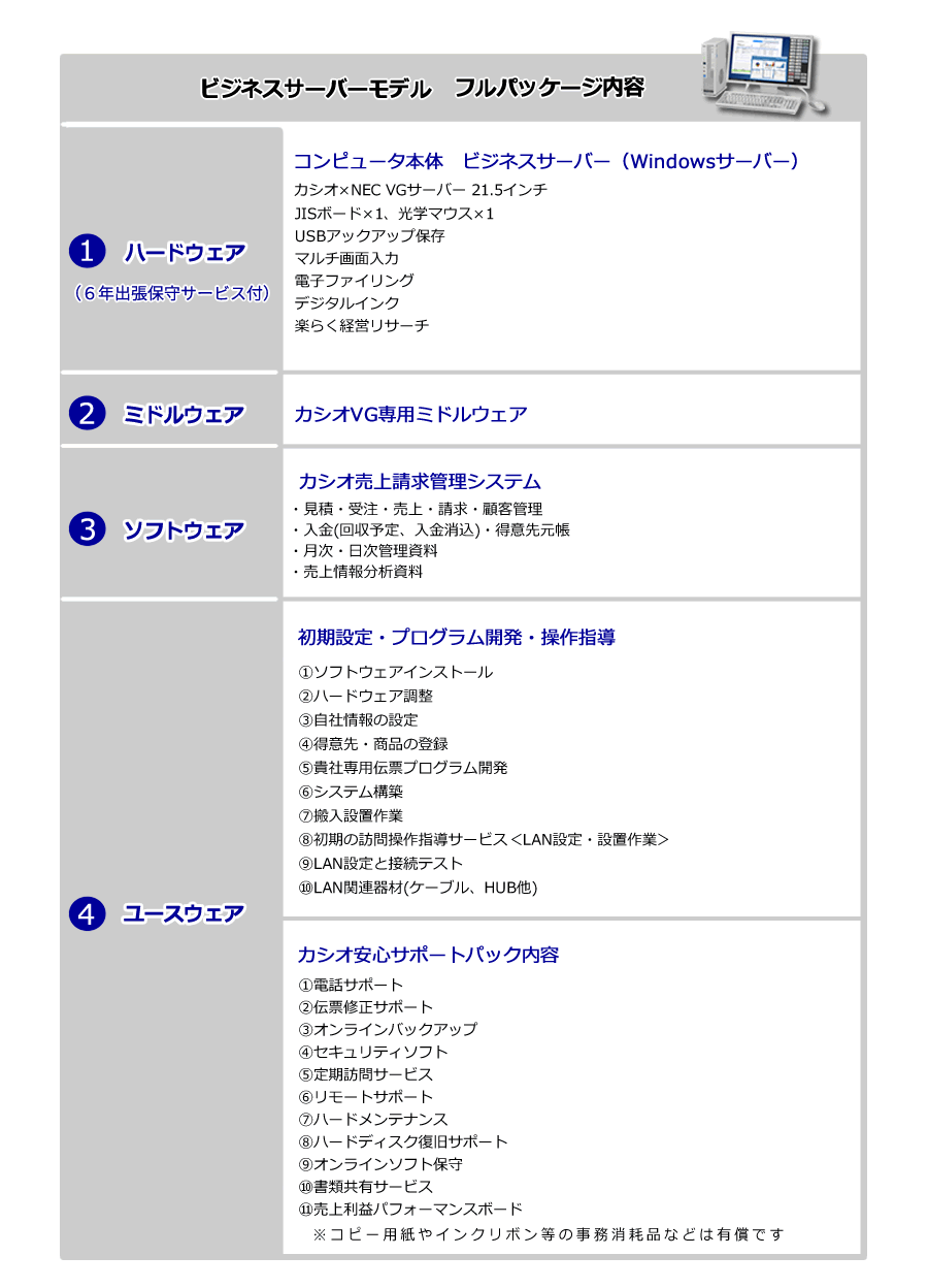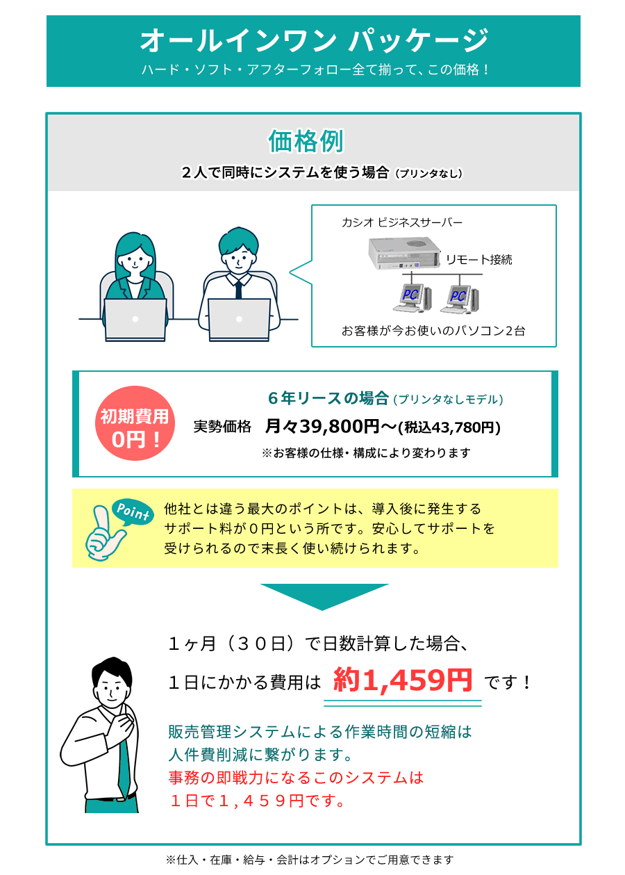 カシオ販売管理システムのサーバーモデルは、今お使いのパソコンを複数台を接続しシステムを稼働することが出来ます。複数の事務員さんが同時に伝票作成などが出来るので、効率的に仕事が進みます。