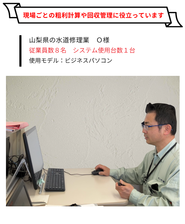 本当に事務処理が楽になりました。現場ごとに請求、仕入、回収管理ができてとても便利です。