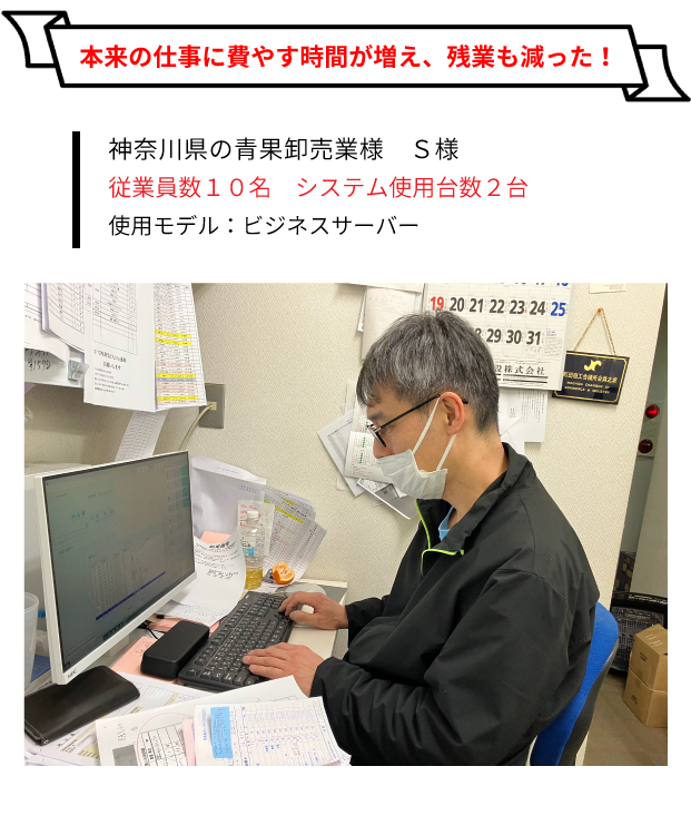 また、当社の商品は季節ごとに入れ替わることが多いので、お客様から「前回、注文した商品をもう一度頼みたい」と言われた時に、以前は前回の商品を探すのが大変でしたが、今では、会社名や商品名、日付、電話番号など好きな方法で顧客データをすぐに呼び出せるので前回売った商品もすぐに呼び出せるようになりました。サポート担当の方も親切に対応してくれて助かっています。