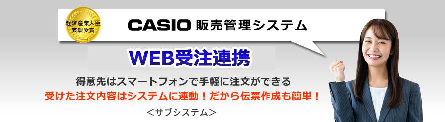 得意先のスマートフォンから商品の注文が入ると、カシオ販売管理システムの画面に注文アラート(お知らせ)が表示されます。そのまま「受注取込み」を行うことで注文データが自動でシステムに連携します。納品書作成時には、その注文データを呼び出せるので、一から入力することなく簡単に伝票作成が出来るので、事務効率がアップします!