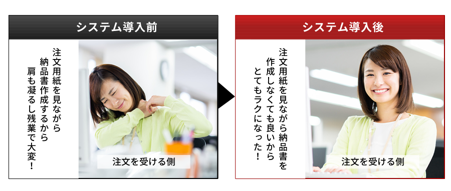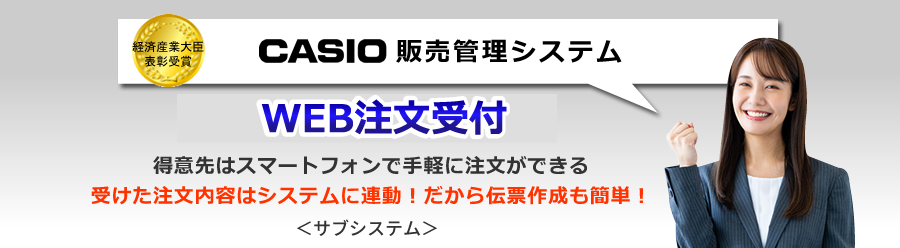 得意先のスマートフォンから商品の注文が入ると、カシオ販売管理システムの画面に注文アラート(お知らせ)が表示されます。そのまま「受注取込み」を行うことで注文データが自動でシステムに連動します。納品書作成時には、その注文データを呼び出せるので、一から入力することなく簡単に伝票作成が出来るので、事務効率がアップします!