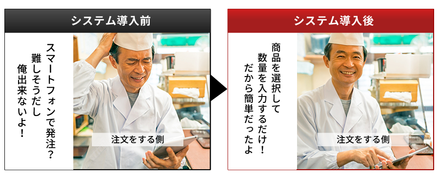 スマートフォンでの注文入力がとてもシンプルで簡単なので、IT機器の操作が苦手な得意先でも安心して使えます。